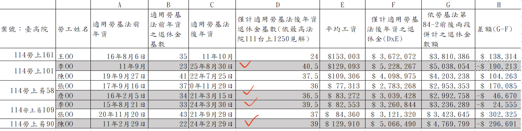 作者於茲要特別聲明的是:114勞上101勞工李OO適用勞基法年資超過25年,故單獨僅計適用勞基法後年資即足符合自請退休要件。其餘三人適用勞基法後年資分別為:21年3月15日、24年3月30日、24年2月29日,惟因一、二審判決書並未載明這三名勞工的年齡,因此作者無法確知這三人單獨僅計適用勞基法後年資後是否已經符合自請退休要件。本文在此為說明簡便,均假設這三人都已年滿55歲以上,因此單獨僅計適用勞基法後年資也都已符合自請退休要件。